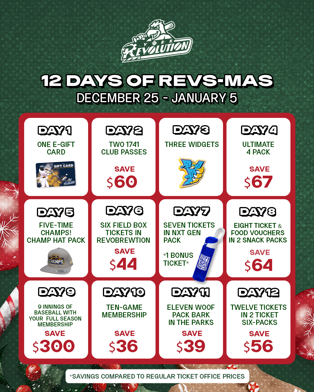 12/31 — Day 7 -Seven tickets (today only) in your NxtGenRevs club, ages 13-17 — 1 bonus ticket! 01/01 — Day 8 -Eight undated ticket vouchers & eight $5 food vouchers when you buy two Snack Packs — save $64! 01/02 — Day 9 -Nine innings of RevsTime EVERY home game when you become a Full Season Member — save $300! 01/03 — Day 10 -Ten Games of Revs Fun with a 10-game plan — save $36! 01/04 — Day 11 -Eleven Tuesday games to choose from to use your six tickets in your Woof Pack membership — save $39! 01/05 — Day 12 -Twelve tickets in two six packs — save $56!